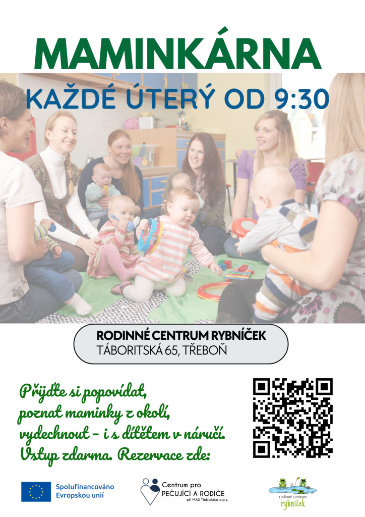 Nyní mají maminky možnost scházet se i v Třeboni – každé úterý od 9:30 hodin v prostorách Rybníčku (Táboritská 65). Přijít mohou i s děťátkem, popovídat si, sdílet zkušenosti a načerpat vzájemnou podporu v bezpečném a přátelském prostředí.