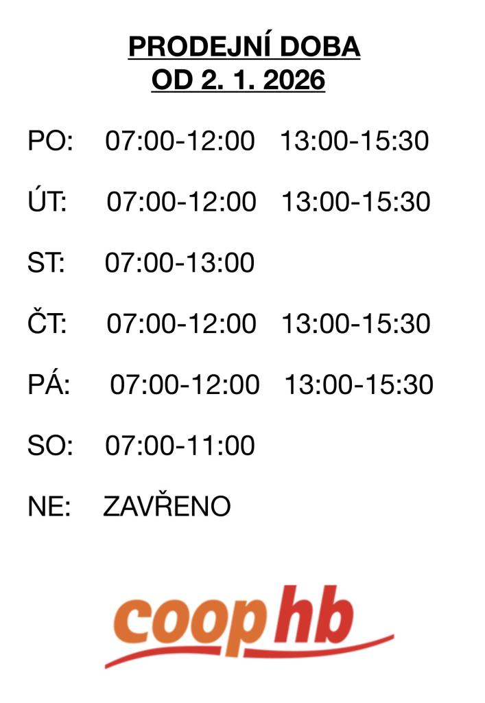 Vážení spoluobčané, upozorňujeme vás na změnu otevírací doby provozovny potravin Coop HB v Rapšachu.