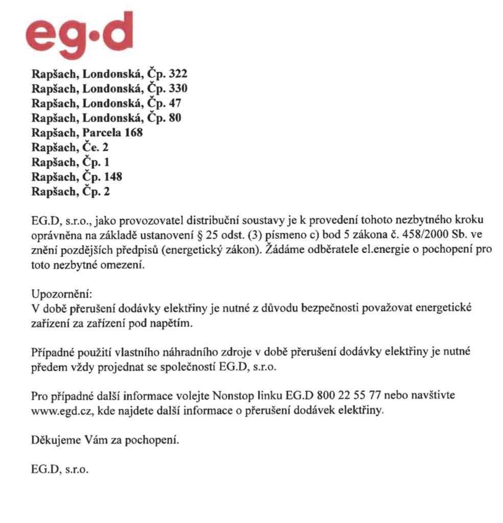 Dne 25. 11. 2025 bude přerušena dodávka elektrické energie. Přerušení je plánováno od 7:30 do 15:30, a v prostorách dětského tábořiště Tokániště bude odstávka probíhat až do 18:30. Seznam dotčených míst naleznete v příloze. Děkujeme za pochopení!