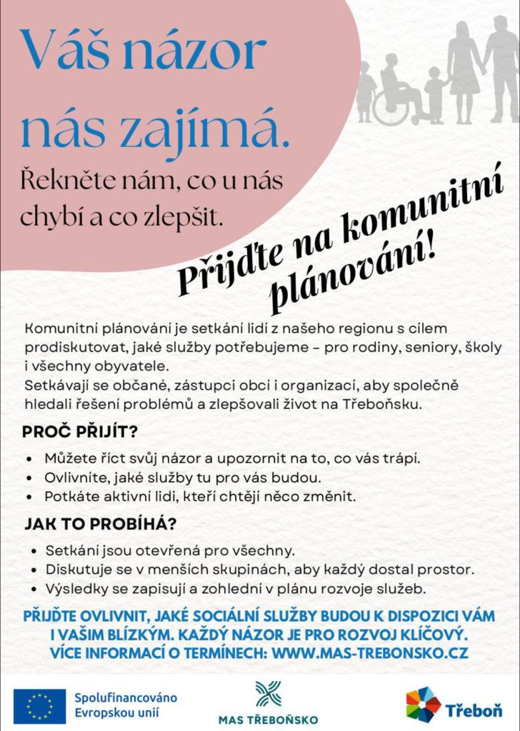 V říjnu proběhnou také dvě pracovní skupiny v rámci Komunitního plánování sociálních služeb na Třeboňsku, na kterém se aktivně podílíme. Víte, že můžete ovlivnit, jaké služby budou v našem regionu dostupné vám i vašim blízkým? Stačí přijít na veřejné setkání, kde se společně mluví o tom, co chybí a co je potřeba zlepšit.