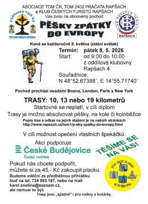 Zveme vás na oblíbený pochod Pěšky zpátky do Evropy, který se uskuteční v pátek 8. května 2026. Start je mezi 9:00 a 10:00 od oddílové klubovny v Rapšachu čp. 4.