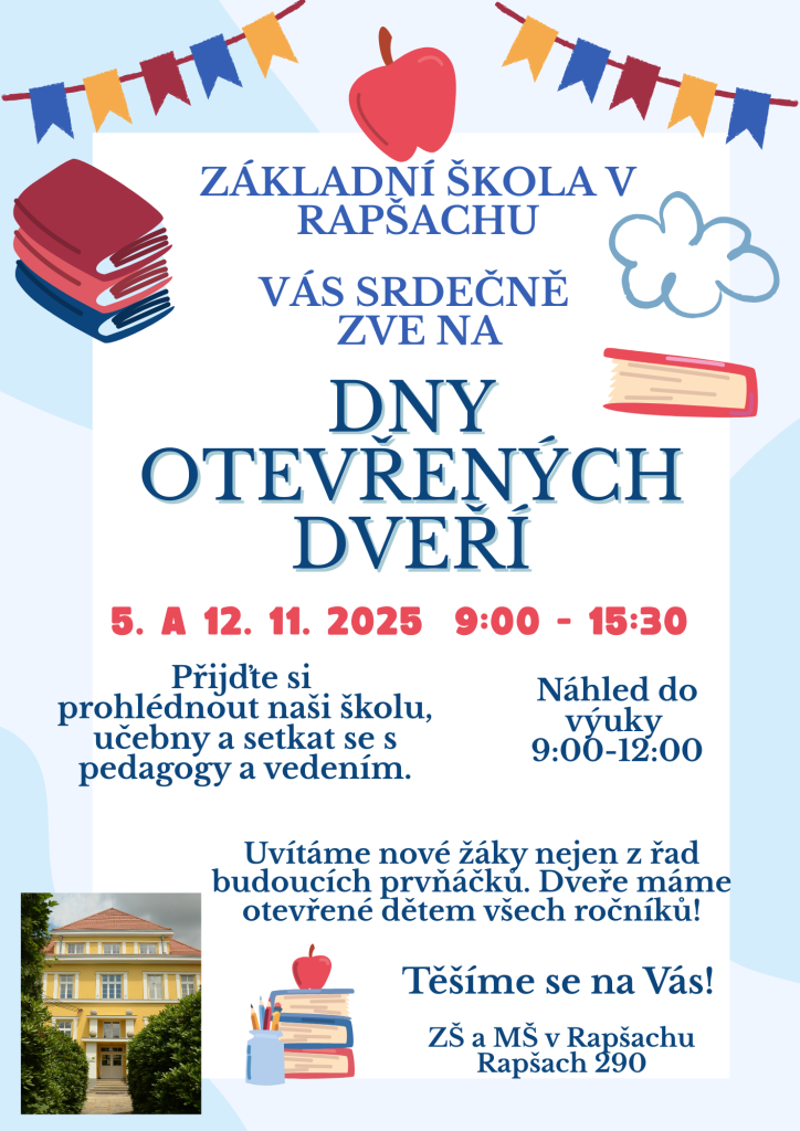 Základní škola v Rapšachu srdečně zve na Dny otevřených dveří, které se budou konat 5. a 12. 11. 2025 od 9:00 do 15:30.